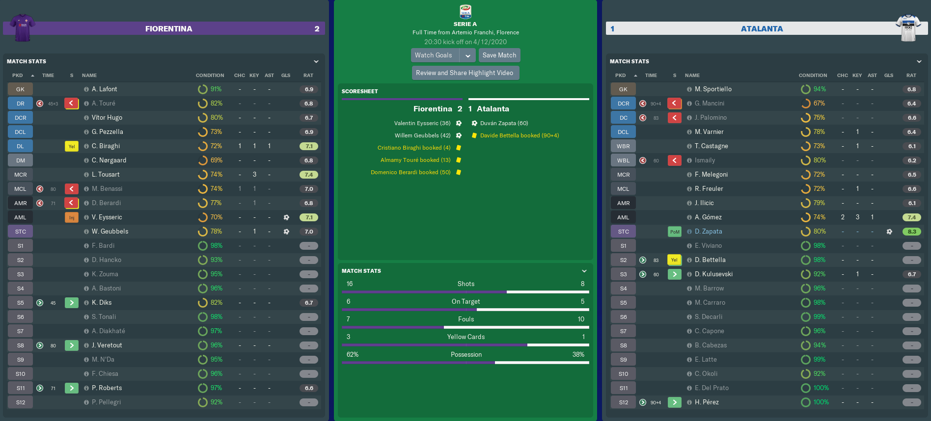 FIORENTINA vs ATALANTA (Serie A, Match 16)
