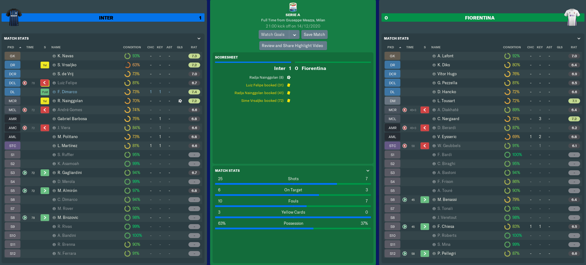 INTERNAZIONALE vs FIORENTINA (Serie A, Match 17)