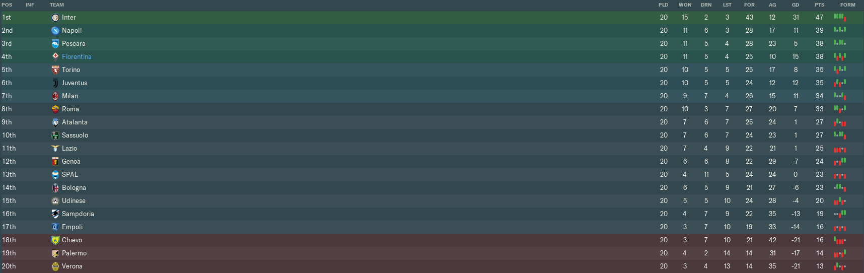 That meant Pescara improbably reached the halfway stage of the Serie A season in 2nd place. Napoli’s 2-2 draw with Torino knocked us down into 4th, while Milan closed their deficit on us to a single point by beating Palermo 2-0. Juventus’ nightmare continued when they were held at Bologna.