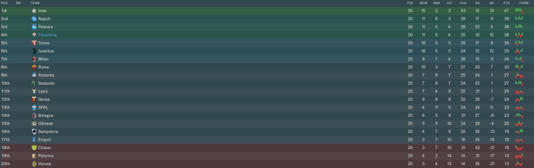 We just about remain in Serie A’s top four going into the mid-season interval. Significantly, though, we hold a three-point lead on 5th-placed Torino (who edged a five-goal thriller with SPAL) and 6th-placed Juventus (who ended their barren run at Empoli). Milan fell to 7th after a surprise home defeat to Sampdoria.