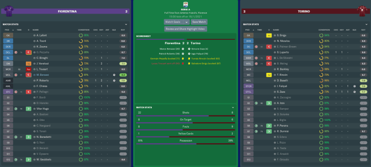 Thankfully, Torino couldn’t quite turn their man advantage into a late victory. A four-goal thriller ended with Walter Mazzarri and me sharing the spoils.