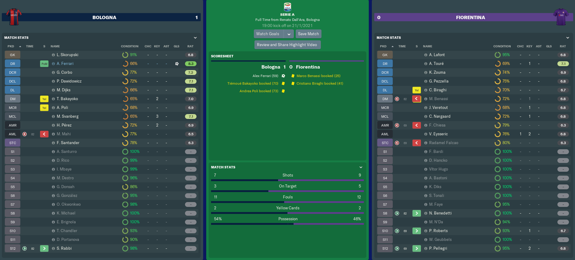BOLOGNA vs FIORENTINA (Serie A, Match 22)