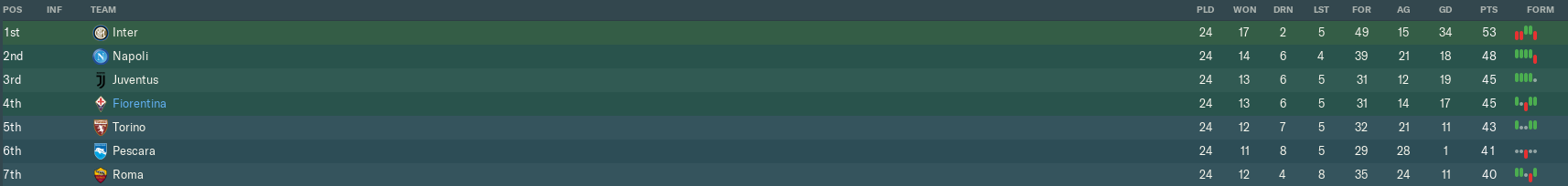 And with that, we were out of the Champions League places. Juventus had won 3-0 at Verona to climb up to 3rd at our expense, also leapfrogging Pescara, who were thrashed 4-0 at home by Inter. We could potentially have fallen as low as 6th, but Torino conceded a 92nd-minute equaliser to Chievo and thus missed their chance.