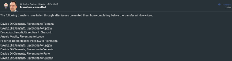 Bernardeschi now had the best part of 14 hours to weigh up his options. Meanwhile, I tried to make room for him by placing Domenico Berardi on the transfer list. Though we couldn’t find a buyer, Berardi’s former club Sassuolo did agree to take him on loan whilst paying his wages in full.