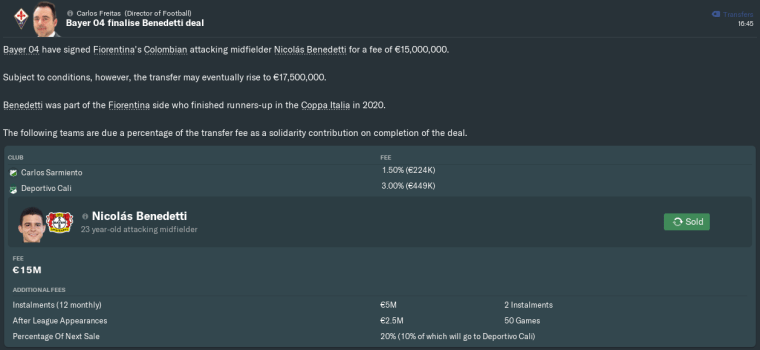 Yes, we’ve said goodbye to Nicolás Benedetti. Bayer Leverkusen originally offered €11million, but some shrewd negotiating got us a deal that I was very happy to accept. €17.5million was a fair amount for a capable box-to-box player who had done okay during his 18 months in Florence without ever being spectacular. It also represented a huge profit on the €600,000 we paid Deportivo Cali for him in 2019.