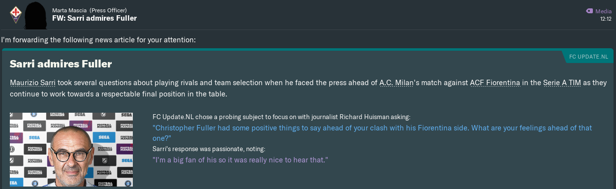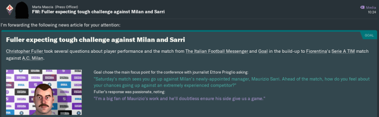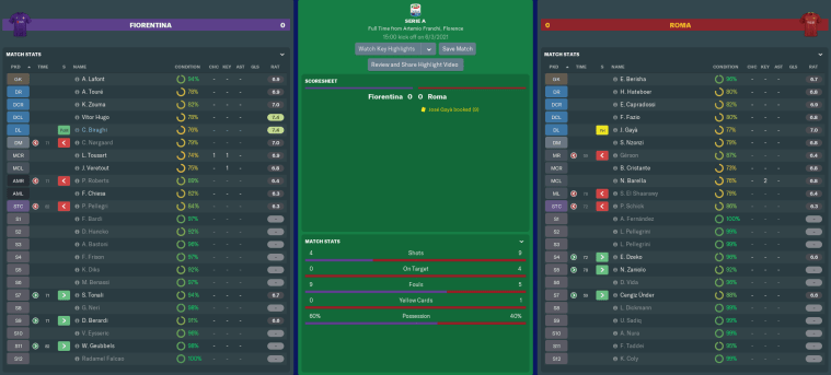 I make that eight games unbeaten now for Fiorentina. If we can keep that form up over the next eight, we should be safely into the Champions League… but as you’ve seen over these first 30 chapters of this story, disaster is never too far away. I’m equal parts excited and anxious about what’s to come in Part 31.