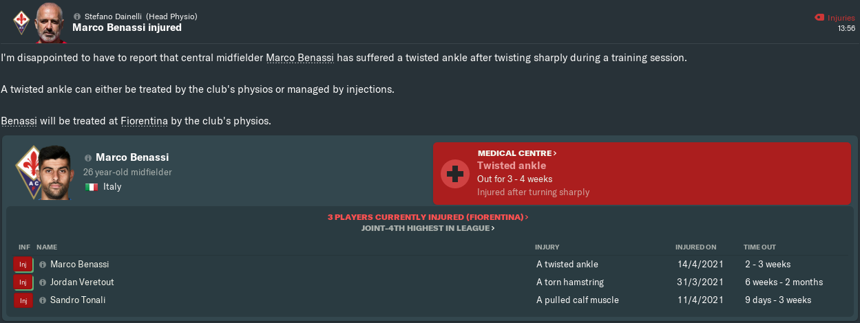 You’ll remember that Jordan Veretout tore his hamstring right at the end of the last part, thus bringing his season to a premature end. Having sold Nicolás Benedetti a couple of months before then, I was now left with just four senior central midfielders.