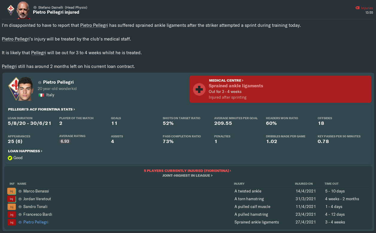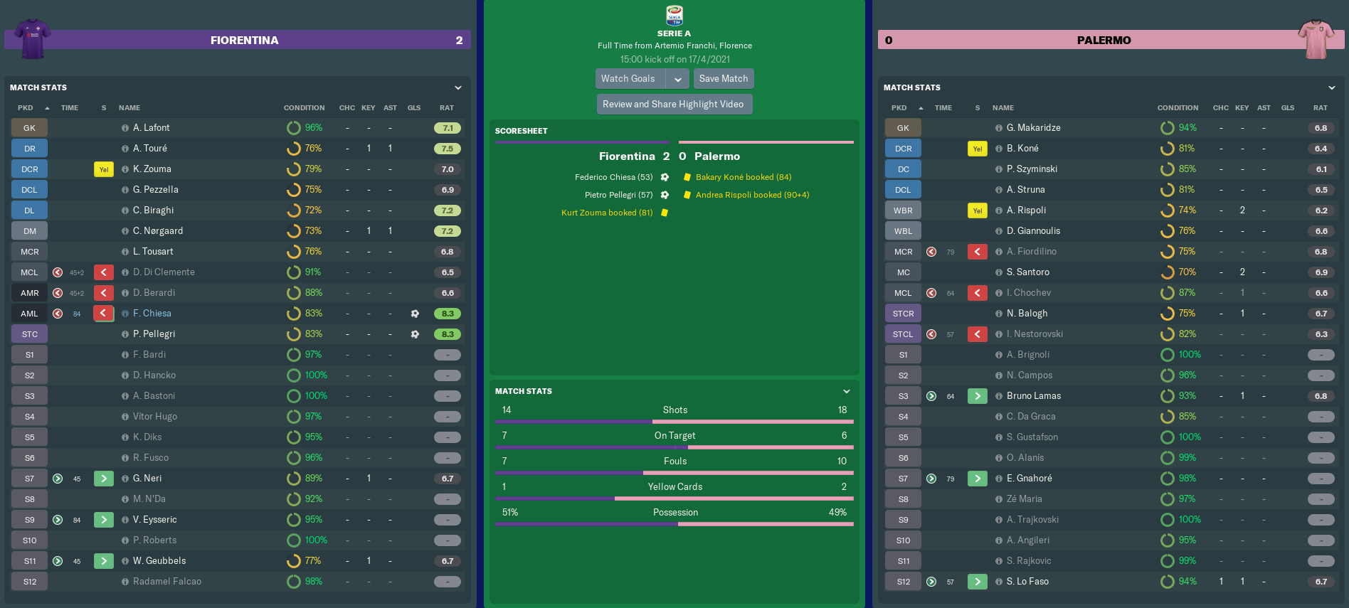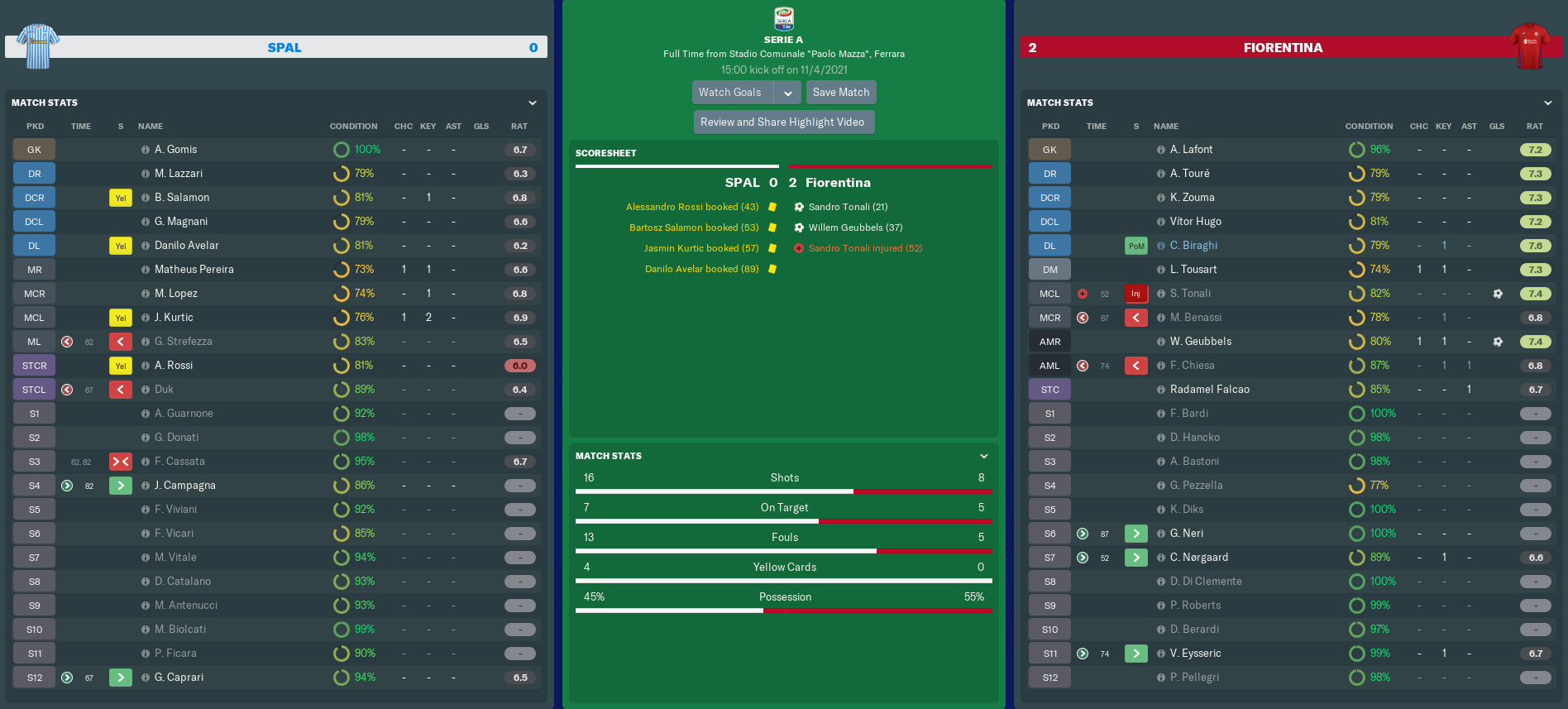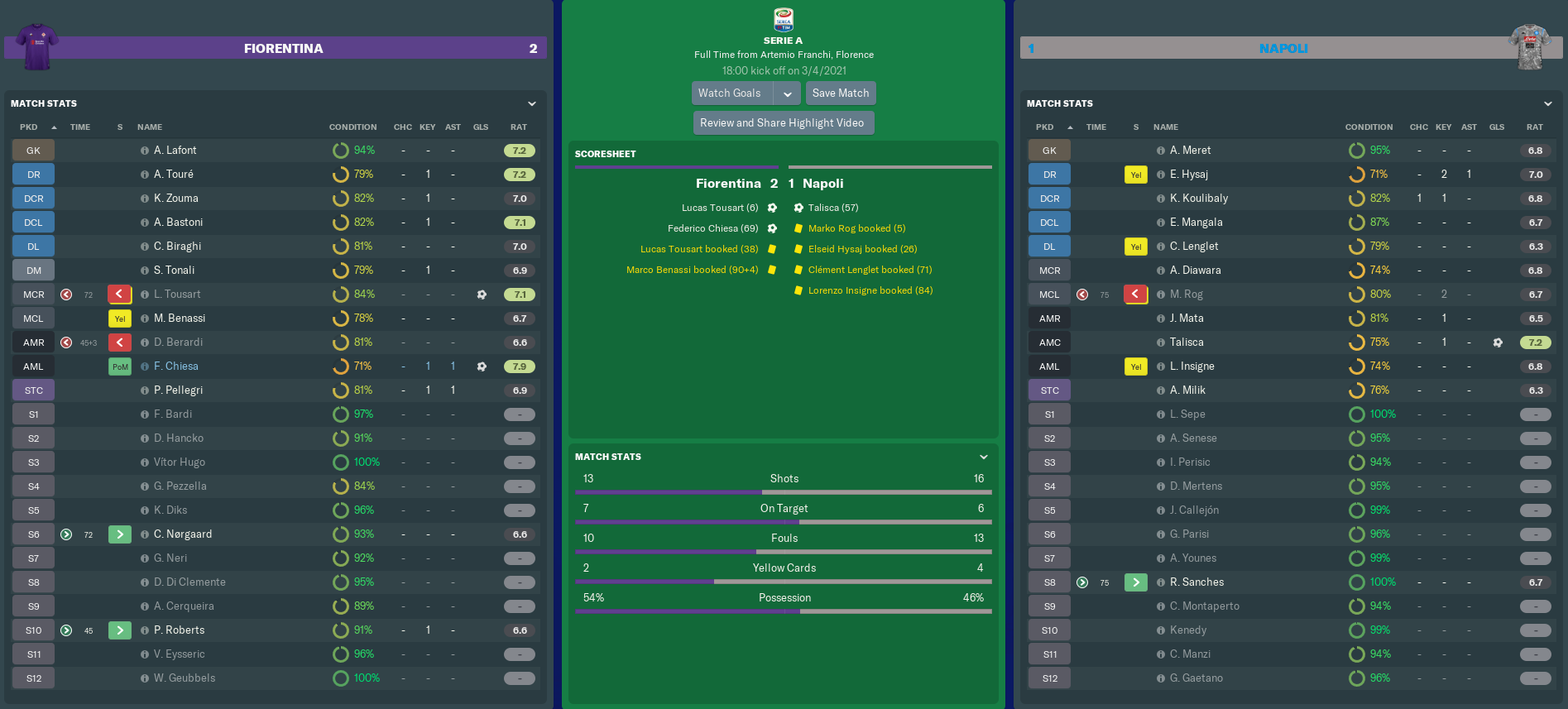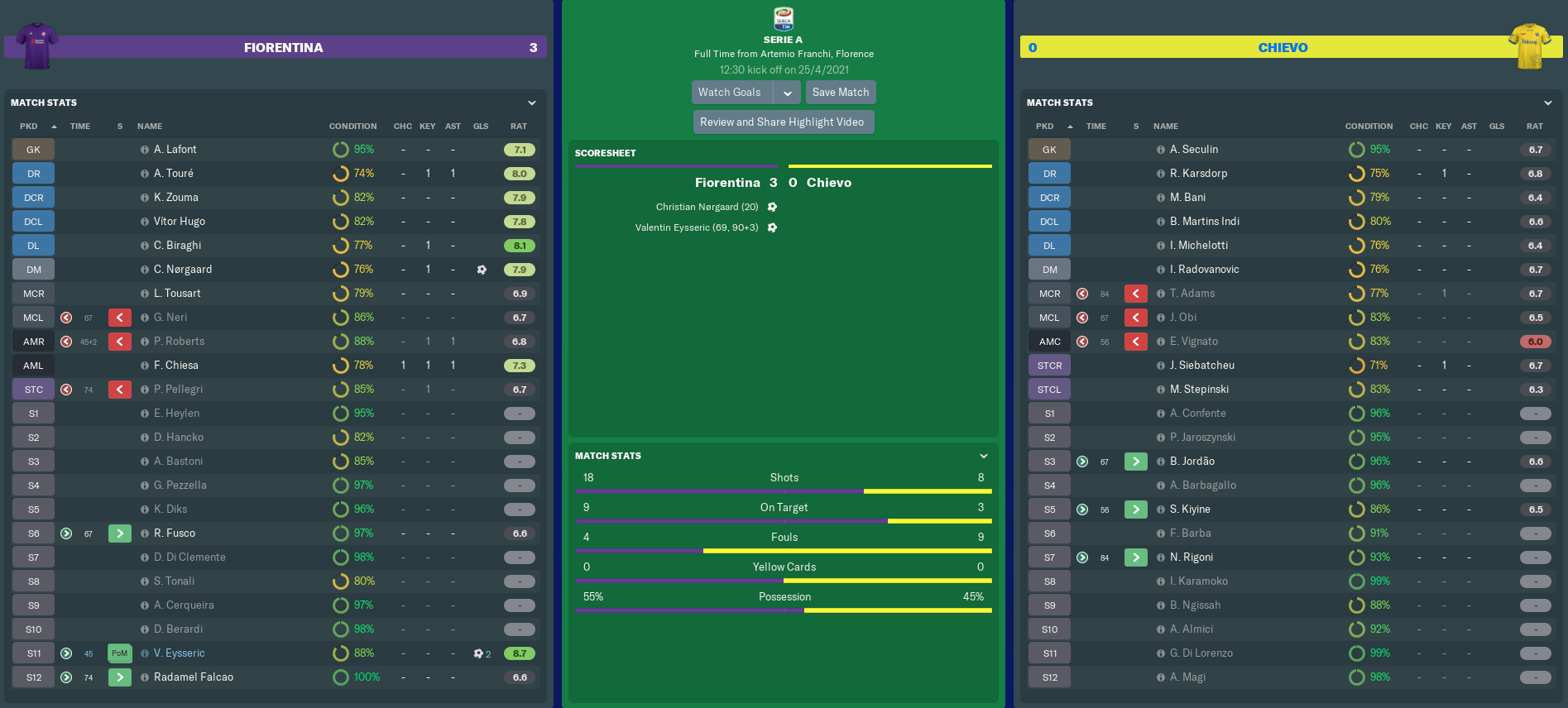 Seculin had plenty of work to do to keep Chievo’s heads above water in the second period. Zouma was twice kept off the scoreboard, while substitutes Eysseric and Neri also had shots saved. Neri had grown gradually more apprehensive as the match had progressed, so after 67 minutes, I decided to take him out of the firing line. Taking his place was 17-year-old Fusco – the first ‘newgen’ to make a competitive debut for Fiorentina in this save.