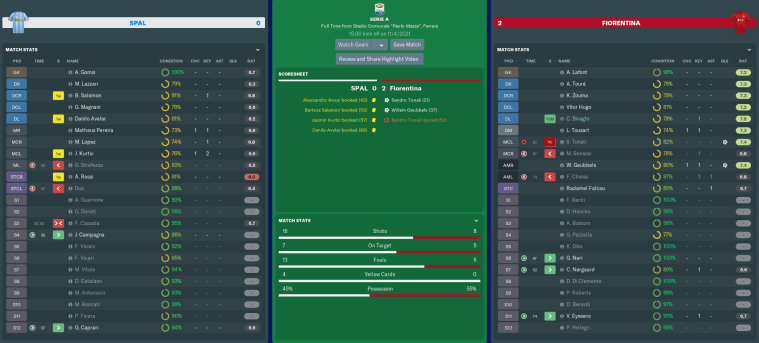 SPAL vs FIORENTINA (Serie A, Match 32)