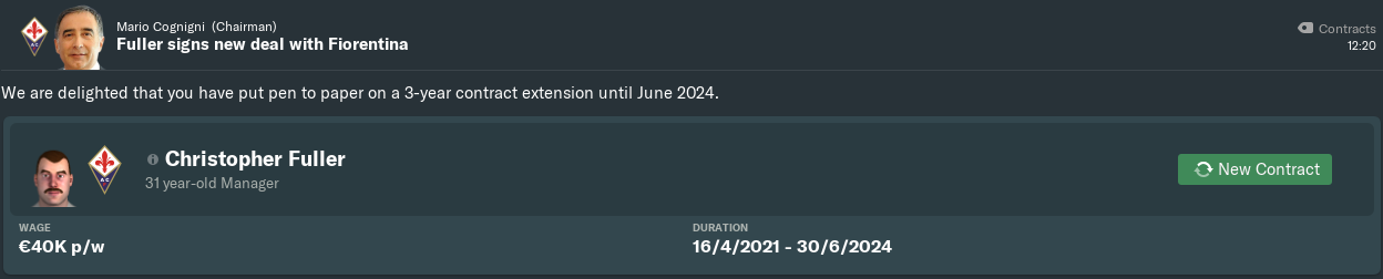 On a brighter note, the board were now happy to offer me a new contract, which had three months left to run. I was hoping to postpone the talks until the end of the season, but the game didn’t give me the option (an oversight on SI’s part, maybe?). Even so, with Fiorentina now looking good to qualify for the Champions League, I was happy enough to commit my future to the club.