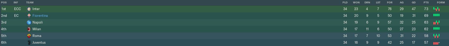 Things were now looking fantastic for us, as most of the teams below us had tripped up. 4th-placed Juventus were now four points behind after losing 1-0 at Chievo, while Roma in 5th were on the wrong end of the same scoreline at Atalanta. Torino let a lead slip three times in a 4-4 draw with Sassuolo, and Pescara were soundly beaten 3-0 at home by Milan.