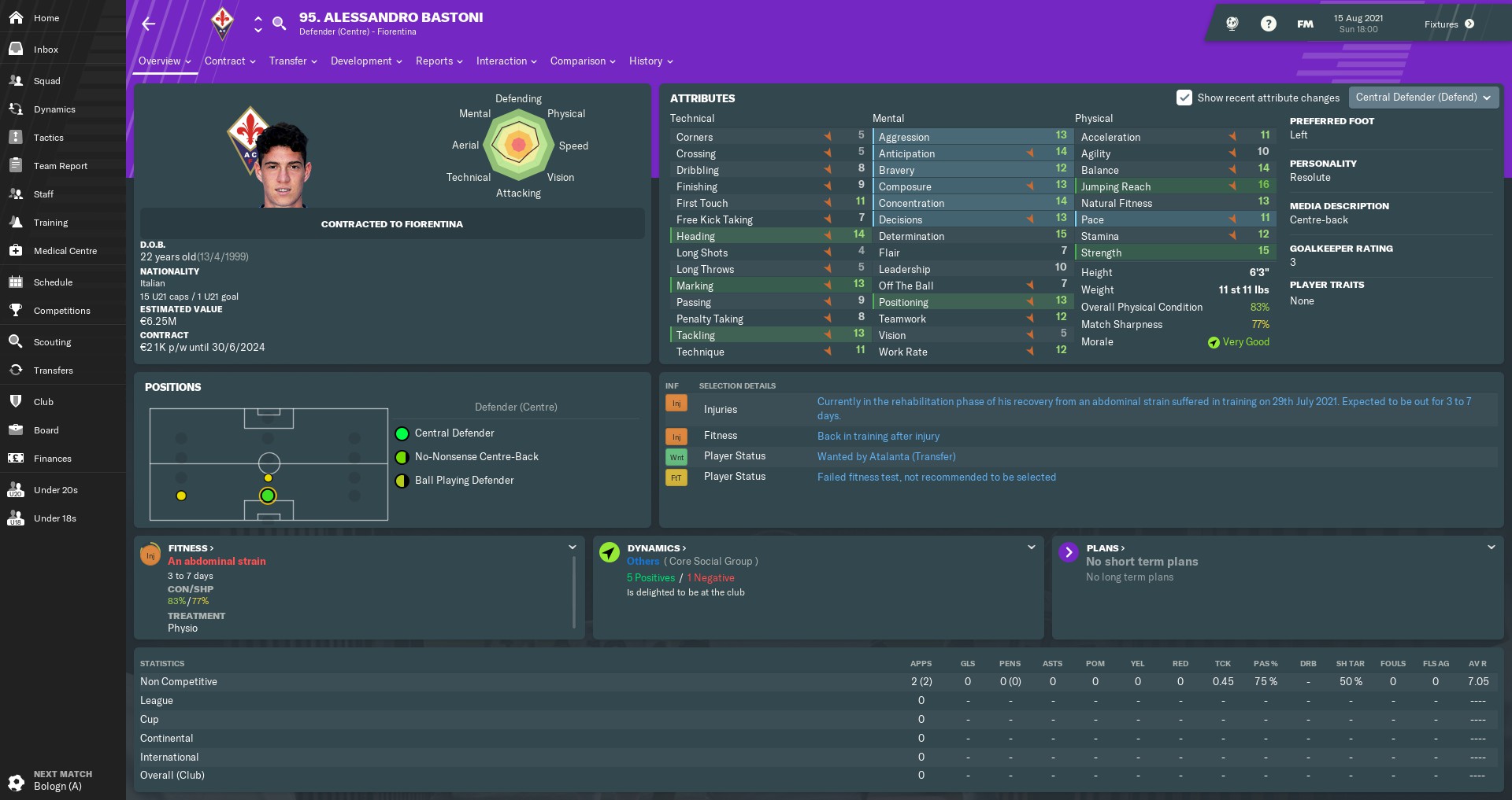 Let’s look at the centre-halves now, and I’ll kick things off with a glance at Alessandro Bastoni‘s attributes. At first glance, Alex hasn’t really improved since his arrival last season, though the 22-year-old has had a couple of undesirable traits trained out of him. After impressing in the latter half of last term, he can expect to see more regular action… once he’s recovered from an abdominal strain sustained in pre-season.