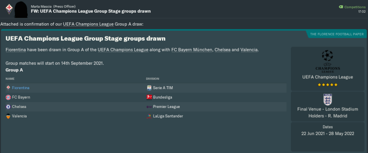 Lastly, we have Valencia, who came 4th in La Liga but finished miles adrift of the ‘Big Three’. If Chelsea and Bayern are expected to qualify from Group A, then ‘Los Che’ are perhaps our main rivals for 3rd place, which would yield a place in the Europa League’s Round of 32. Our late-September meeting at the Franchi could be massive.