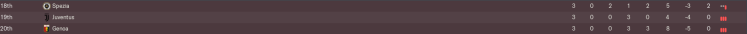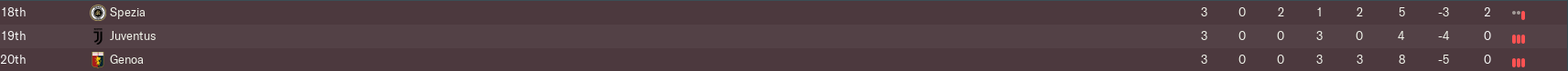 All that means we’re the only team in the division yet to have conceded a goal this season. Conversely, Juventus are the only side who haven’t yet scored. Let me take a screenshot of the relegation zone for prosperity, as I’ve a feeling I might not get another chance: