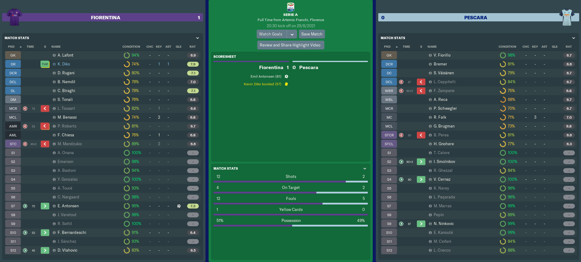 Antonsen’s first competitive Fiorentina goal would be the winner. Pescara sub Valentino Cernaz almost got a fluke equaliser in stoppage time, but a right-wing cross-shot aimed for Harlem Gnohere clipped the outside of Lafont’s post and went behind. Thanks to that stroke of luck, we finished the month with a third consecutive clean sheet!