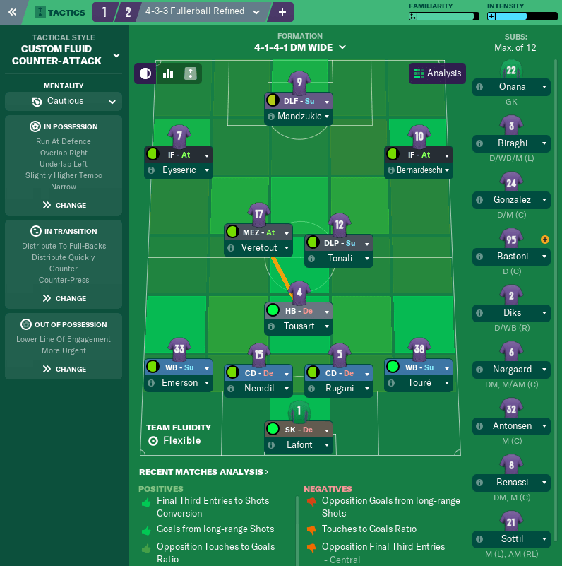 When we have two inside-forwards, though, we seem to lack width or unpredictability. As we don’t have any effective wingers (despite my attempts to stop Chiesa cutting in from both flanks), I’ve instead experimented with using either Federico as a ‘raumdeuter’. If that doesn’t produce consistent results, I might try something even more radical… but I’ll cross that bridge if I come to it.