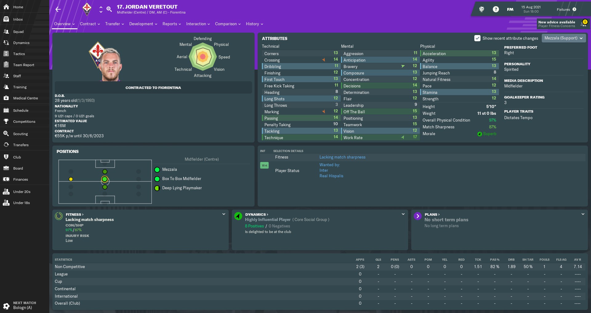 Marco Benassi has a new squad number, and a new contract that should keep the versatile midfielder at Fiorentina throughout his peak years. The 28-year-old always gives us some much-needed bite whenever called upon, and he can carry out many of the roles and duties I use. The draw of the Champions League could also inspire him to have one of his best seasons yet.
