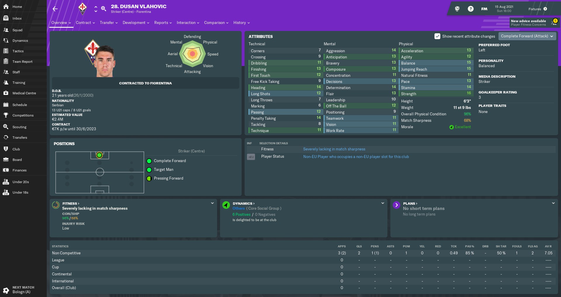 We’ve got three men vying for the lone centre-forward spot, including a 35-year-old and a 17-year-old. Naturally, I’ll first look at 21-year-old Dusan Vlahovic, whose 13 goals on loan with Parma last season weren’t quite enough to take the Crociati back out of Serie B. The Serb has immense physical strength and solid attributes in the relevant places, but I reckon it’s about time he started to fulfil his potential.