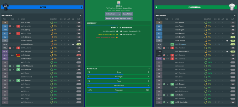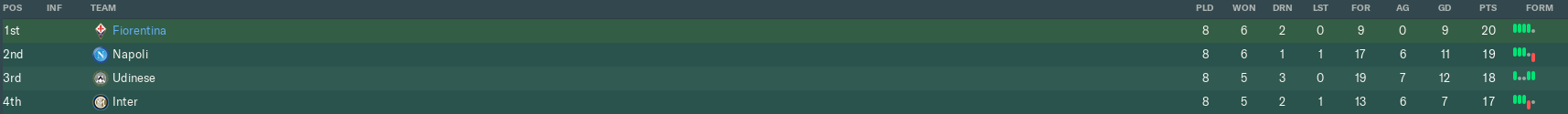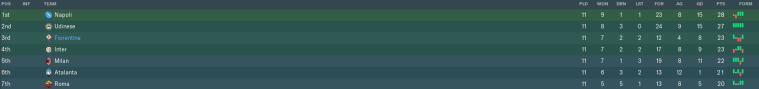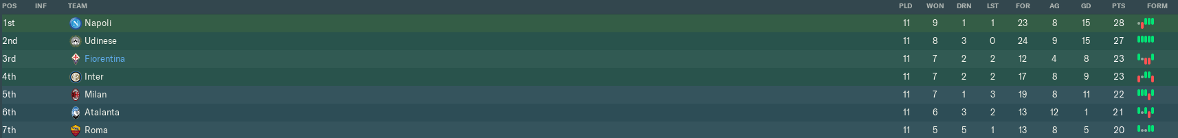 My first ever victory over Inter – at the ninth time of asking – took us above the Nerazzurri into 3rd place. There was still some distance between us and the surprise frontrunners, with Napoli and Udinese having recorded narrow home wins against Lazio and Empoli respectively.
