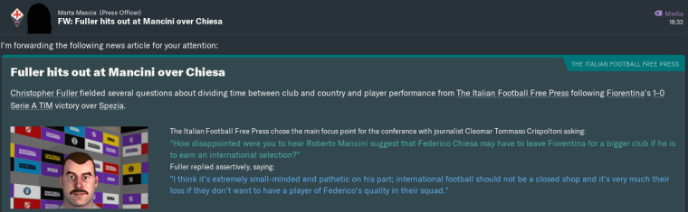 I was not amused by Mancini’s remarks, and I was even less so when he repeated them before the October internationals. Only this time, he suggested that our captain Federico Chiesa should move abroad for the sake of his Italy career, amid continued interest from Paris Saint-Germain and Real Madrid. This was my response: