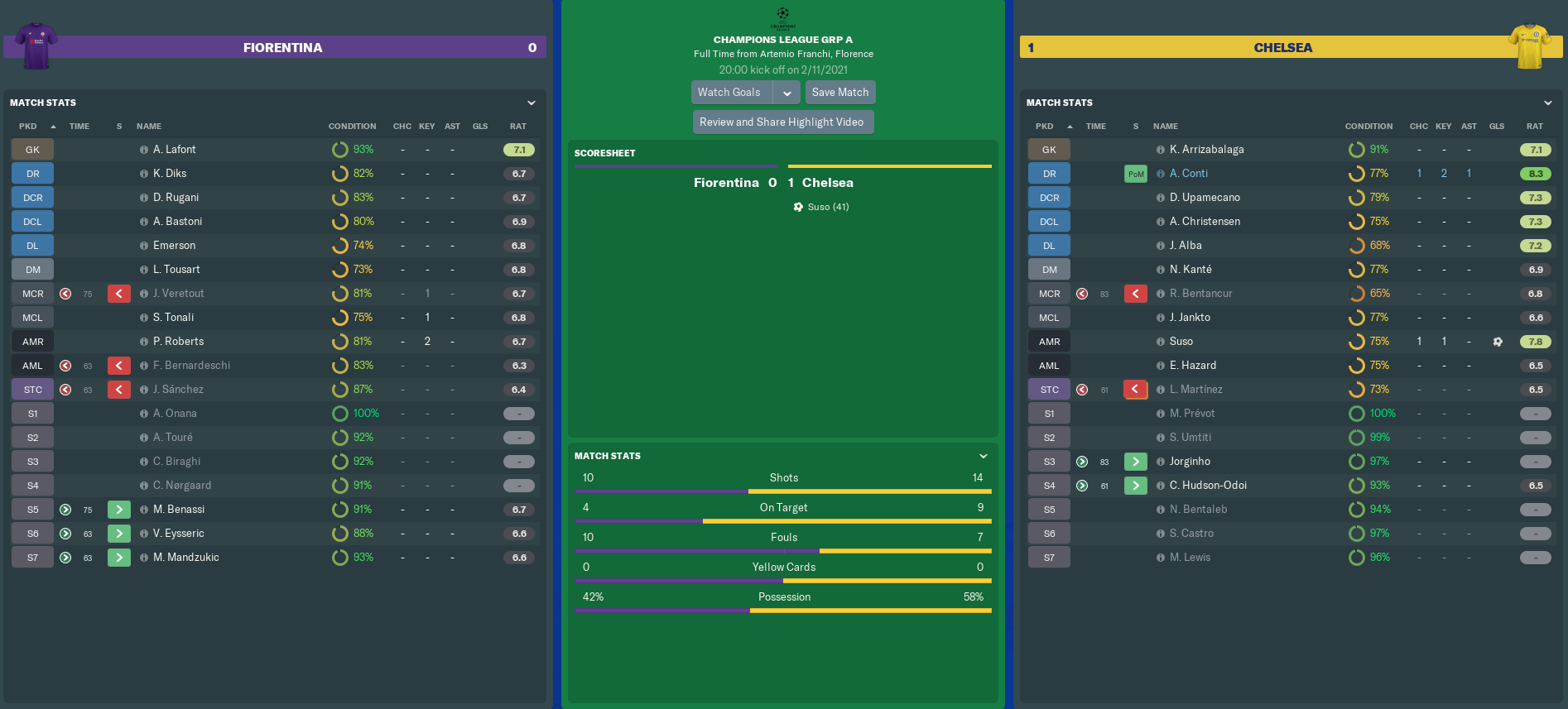 Teenage striker José Luis Sánchez could have restored parity with his first competitive Fiorentina goal moments after the restart. Sadly, the Belgian’s header from Federico Bernardeschi‘s deep left-wing cross was no match for Arrizabalaga. Sánchez’s compatriot Eden Hazard came perilously close to doubling Chelsea’s lead on 53 minutes, but Lafont managed to parry his shot against the post before Kevin Diks cleared.