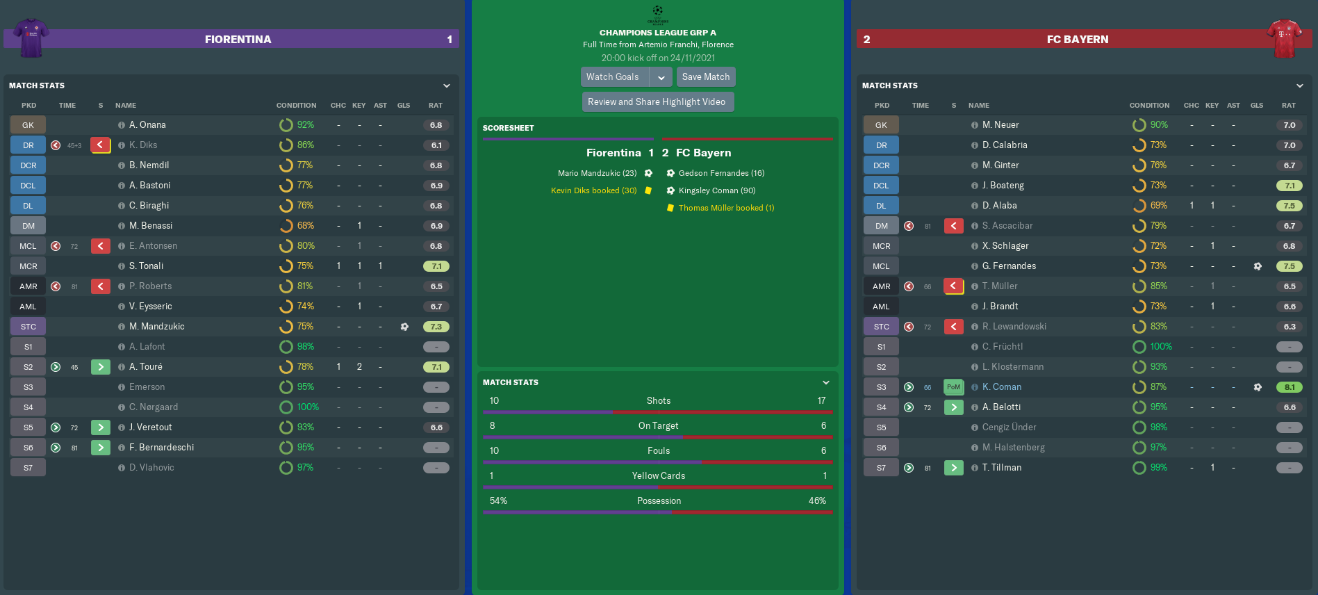 FIORENTINA vs BAYERN MÜNCHEN (Champions League, Group A – Match 5)