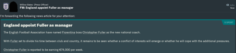 From June onwards in this save, I will concentrate on this new international challenge, rebuilding an England team that has hit its lowest ebb. I will chronicle my exploits on Fuller FM at some point this year*, though that story won’t be starting for a while yet. Once I’m done with Fiorentina, my upcoming Shrewsbury career will take up most of my FM time, with the England challenge becoming my secondary save.