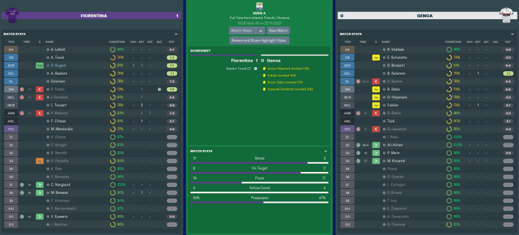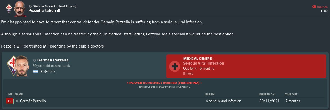 This is the first time I have ever had one of my players contract a ‘serious viral infection’ in FM, and it could be devastating for Pezzella’s career. Missing the first few months of the season through injury was bad enough, but he’ll now have to miss several more. At 30 years old, it’ll be very hard to imagine him getting back to his best physical shape again.