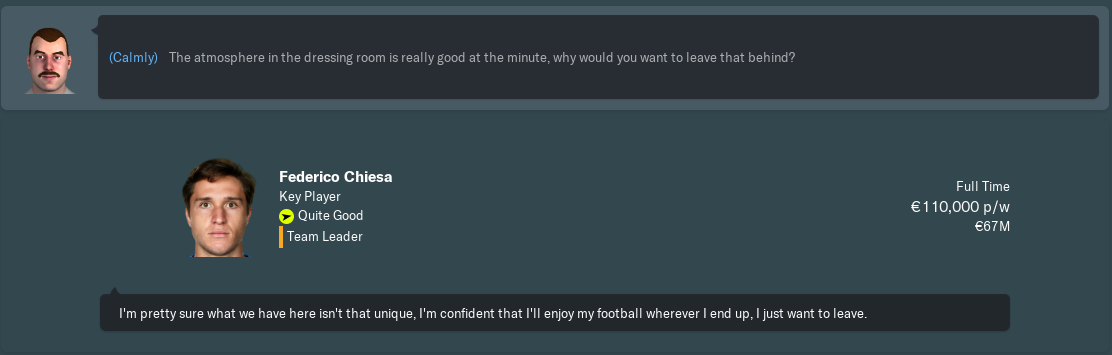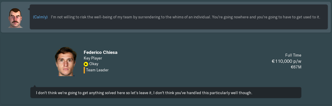 Upsetting your captain is not advisable in most cases, but if I don’t want a particular player to leave, I won’t let them leave. Marco Benassi learnt that last season, and Jordan Veretout the season before. While three players initially agreed that Chiesa should be allowed to move, I changed their minds by stating in no uncertain terms that we could not afford to lose him.