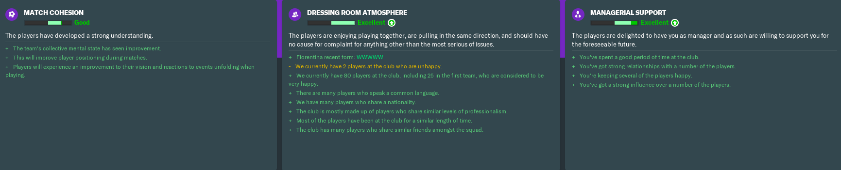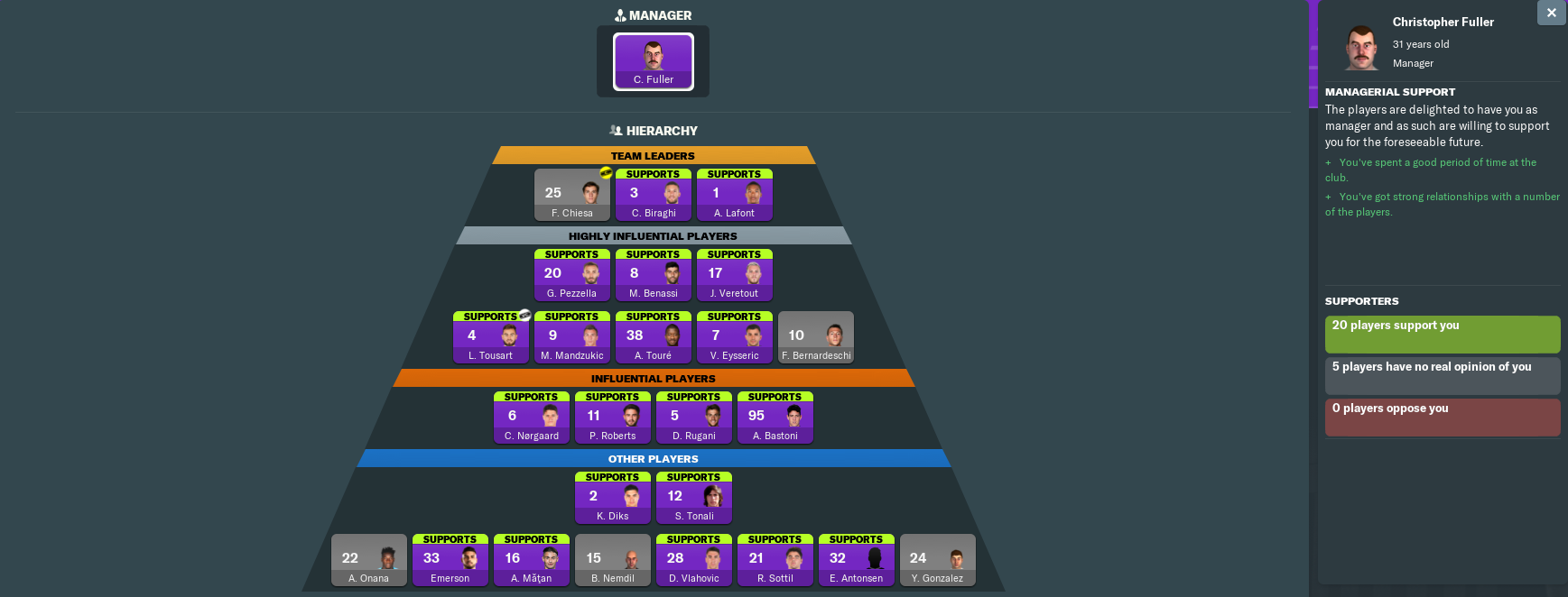 Apart from Chiesa, those players who don’t yet wholeheartedly support me are summer signings. Generally, though, I get on incredibly well with all my players, which in turn helps us to exceed expectations… at least when it comes to domestic competitions. Long may it continue.