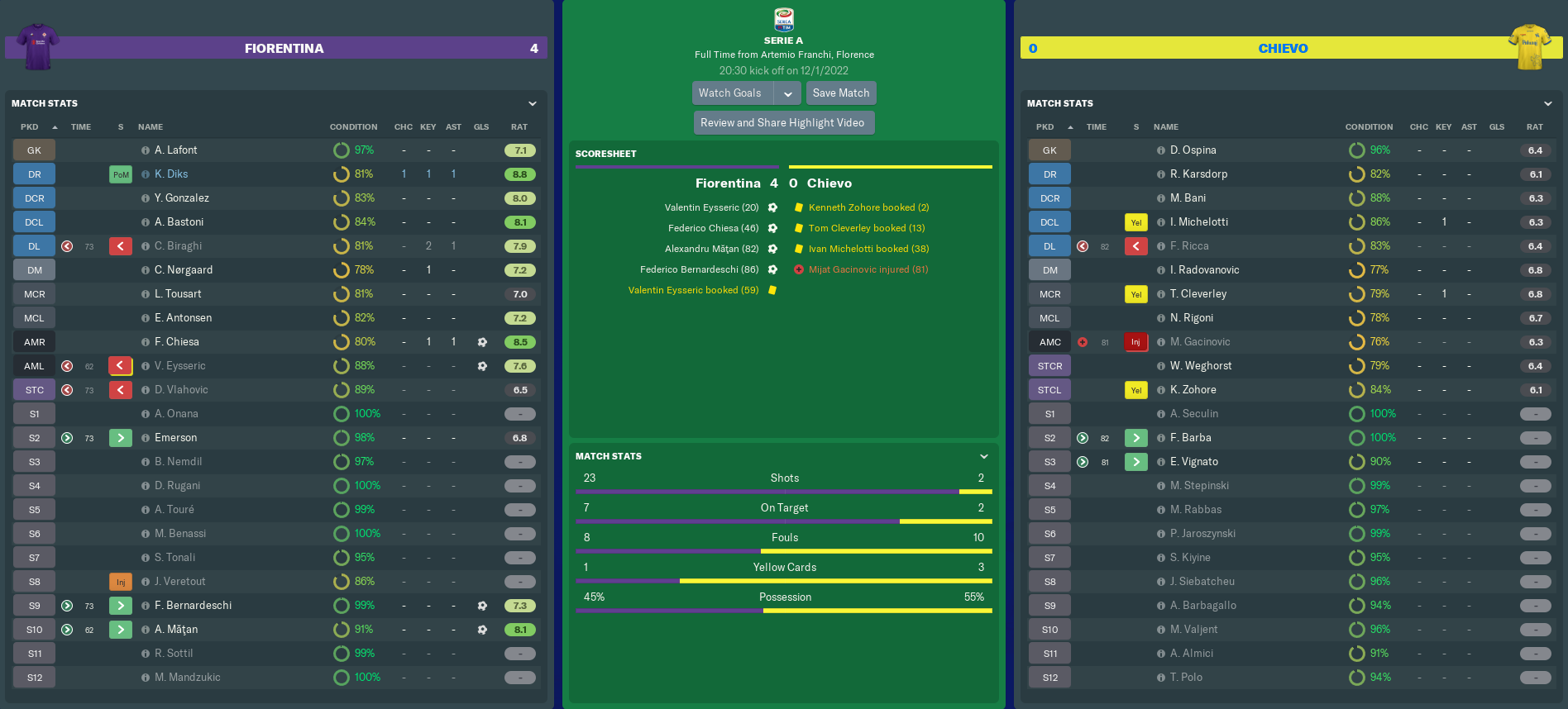 The Clivensi were being overwhelmed, and the loss of attacking midfielder Gacinovic to a groin injury in the 77th minute was devastating. Five minutes later, his replacement Emanuel Vignato gave away a third goal to us. His weak interception of Bernardeschi’s chipped free-kick was picked up by another Fiorentina substitute, and Mățan marked his competitive Viola debut with a tidy finish through a crowded penalty box.
