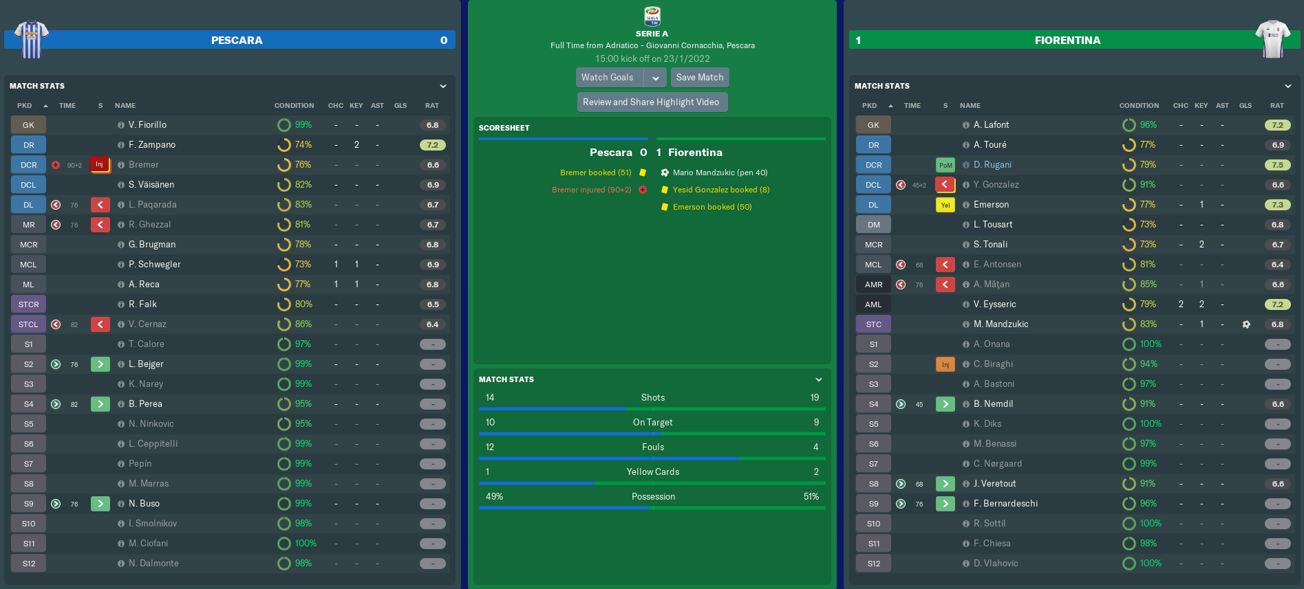 PESCARA vs FIORENTINA (Serie A, Match 22)