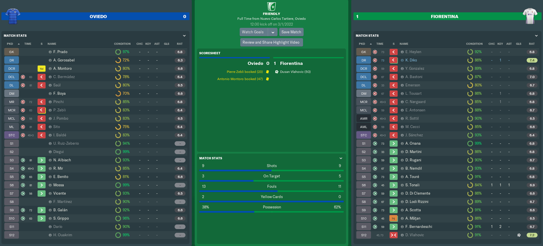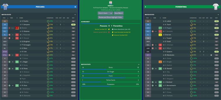 The action would quickly switch between halves for much of the second period, with a Pescara attack quickly being followed by a Fiorentina counter. Lafont had to be in top form to deny Cernaz and Falk potential equalisers, while Mandzukic and substitute Veretout unsuccessfully attempted to send us 2-0 up.