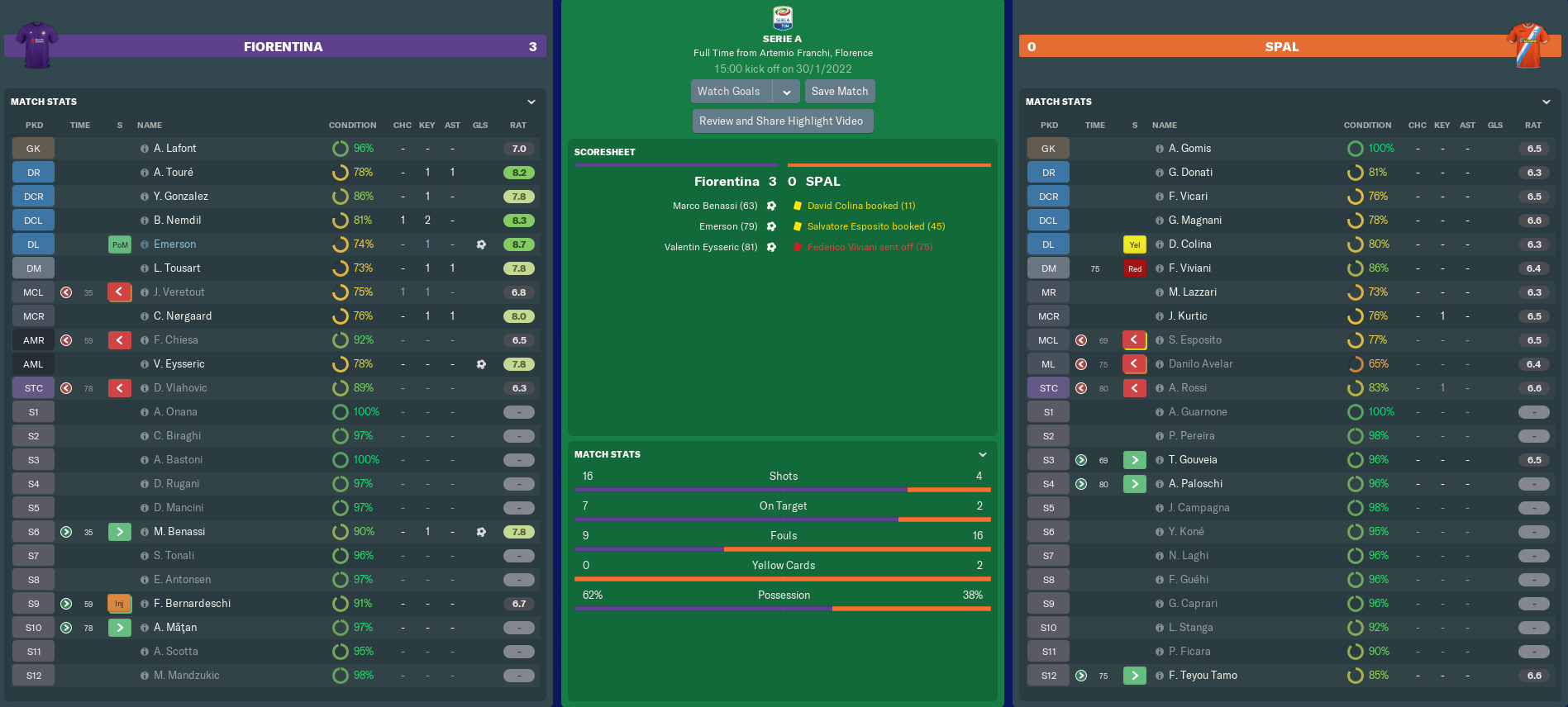 FIORENTINA vs SPAL (Serie A, Match 23)
