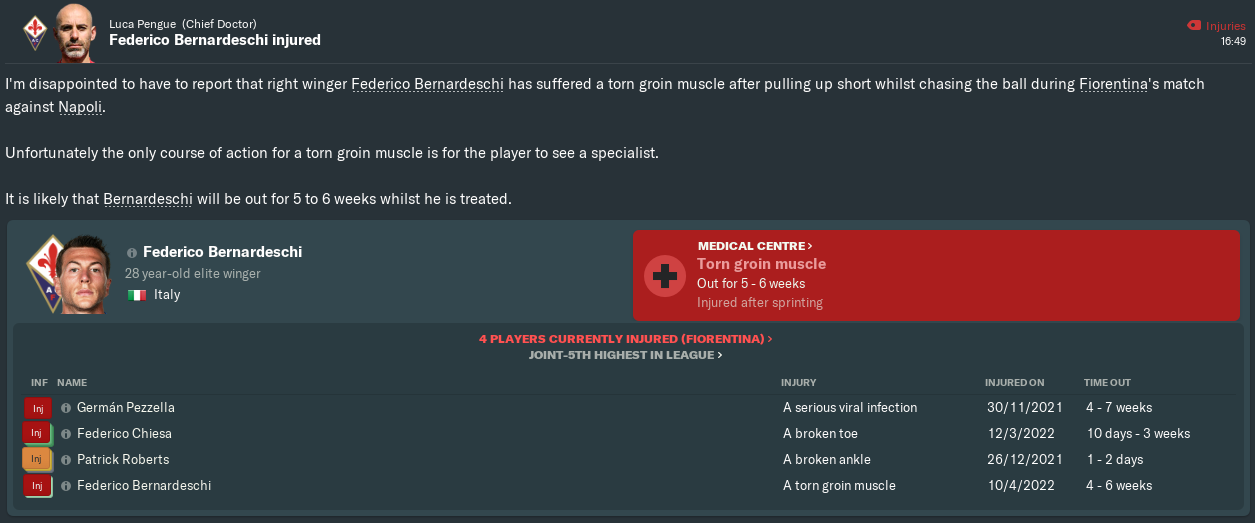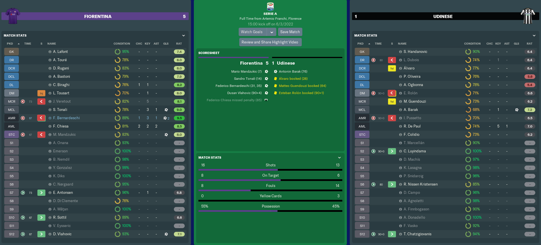 It wasn’t until the 75th minute that we started to look like we could win the game. Măţan came off the bench to provide Benassi with a left-wing cross that was headed into Meret’s hands. Disaster then struck four minutes later, when Bernardeschi hurt his groin mid-dribble and pulled up lame. Scotta took his place in our attack as I put my faith in youth.