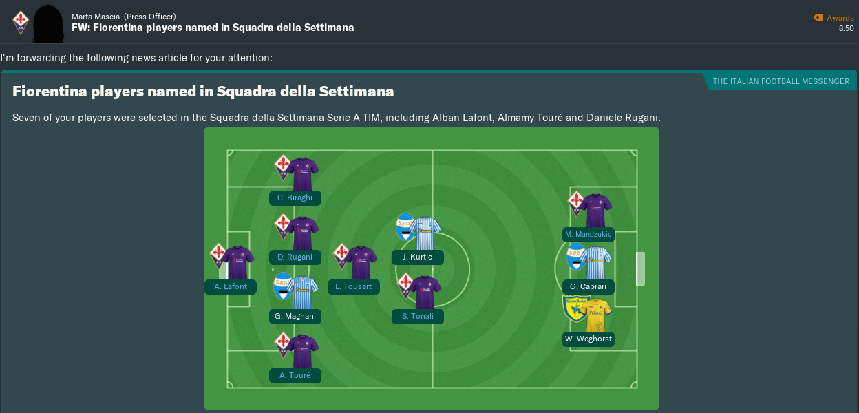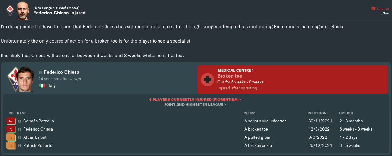 While Chiesa’s injury wasn’t necessarily fatal for our hopes, I would rather have not been without my captain’s services for upcoming matches against Inter, Lazio and Napoli. That wasn’t to say I didn’t have faith in Bernardeschi, Eysseric or Măţan out wide. It was just that Chiesa was our most talented attacker, even while still complaining about not being in Paris, and he would be a significant miss.