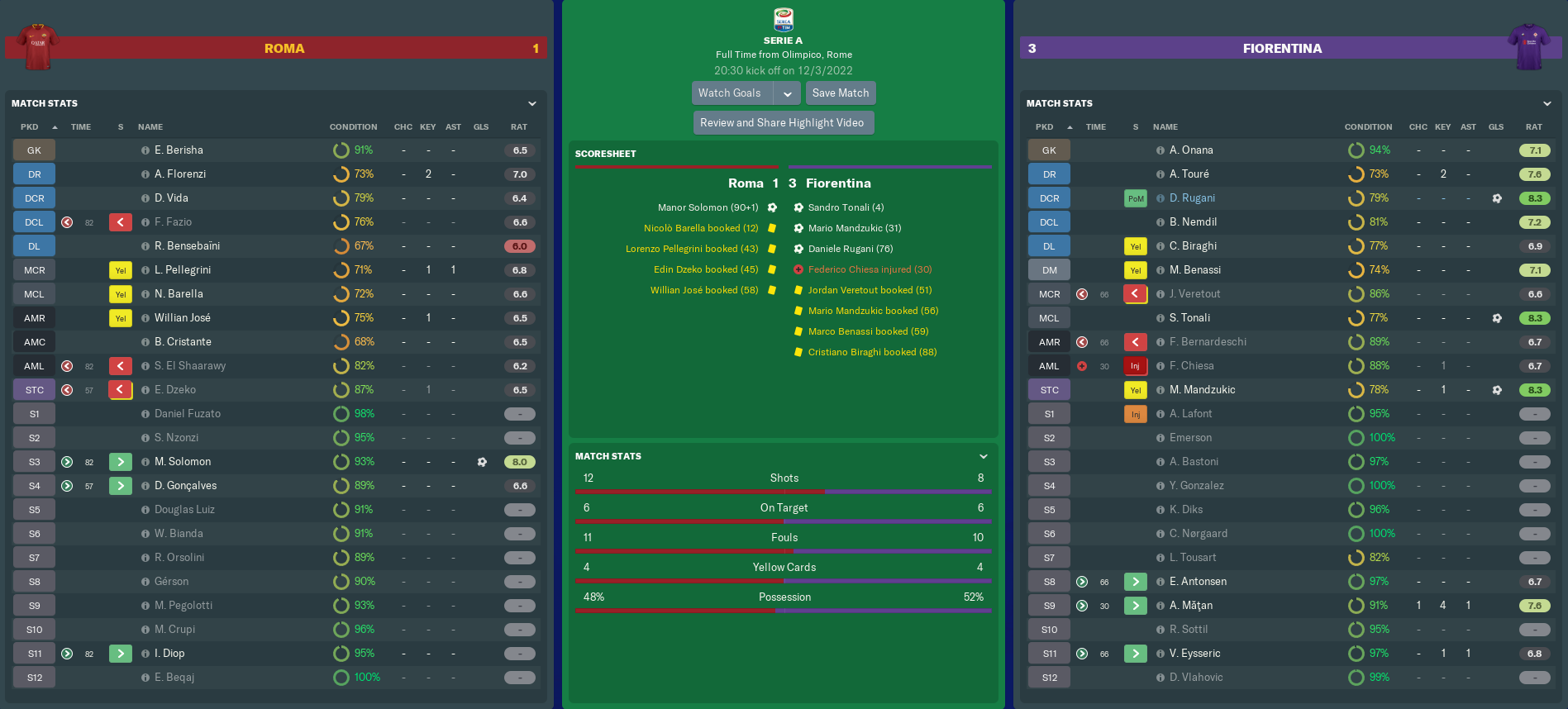While Roma were low on confidence, I had my own problems. After 142 consecutive league starts, Alban Lafont sustained a groin injury and had to sit this match out. That meant second-choice goalkeeper André Onana made his long-awaited Serie A debut.