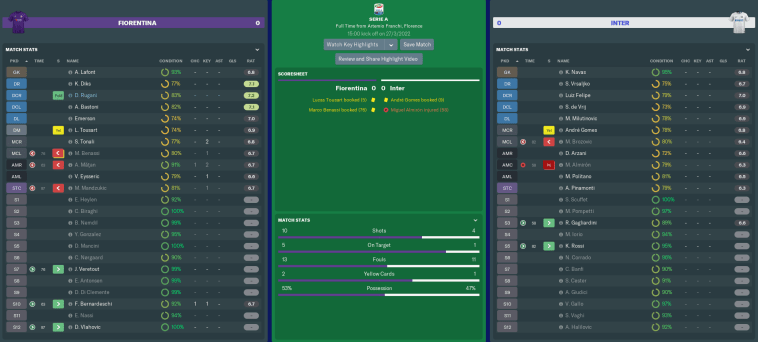 We started to play with a bit more ambition following the interval, even more so after the Nerazzurri lost Almirón to an ankle ligament injury in the 58th minute. Inter rarely threatened us thereafter, as a strong Fiorentina defence headed by Rugani restricted them to just a hopeless long-range shot from Andrea Pinamonti.
