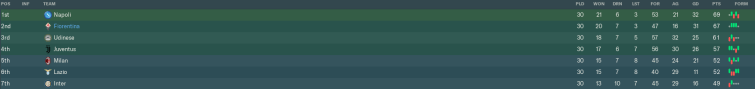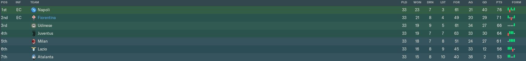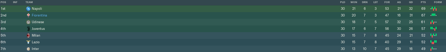 With Udinese having only drawn 0-0 against Milan, we extended our lead on 3rd to six points. However, Napoli remained top by a three-point margin, having returned to ominous form with a 4-0 crushing of lowly Spezia.