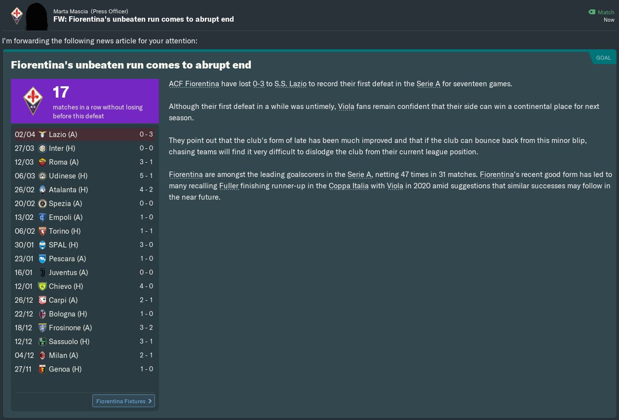 And with that, our long unbeaten run in Serie A was over. 17 and out.