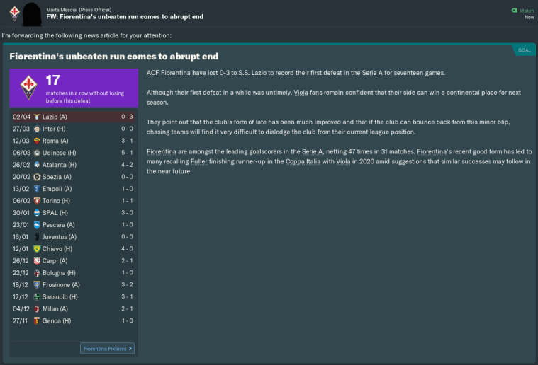 It looks like this championship race could be going right to the wire. Can we overhaul Napoli’s lead and end my Fiorentina reign in glory, or will we fall short once again? Come back soon for what’s sure to be a dramatic final chapter of “Shades of Deep Purple”.