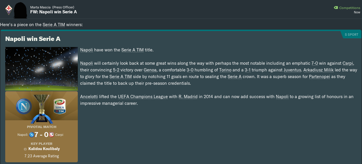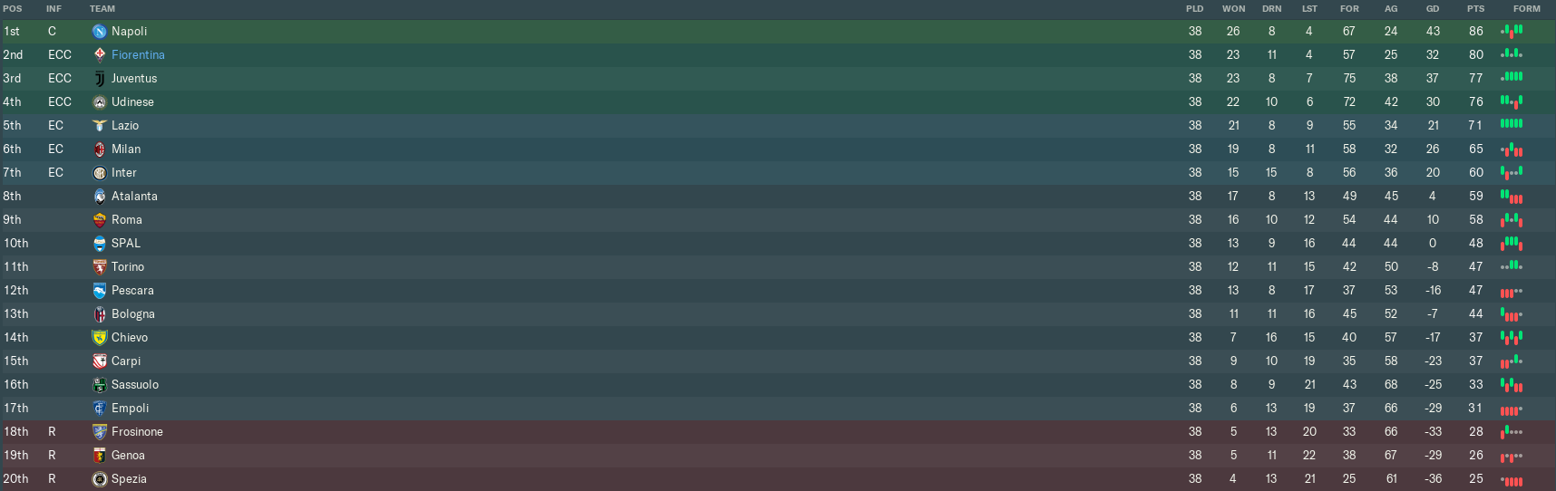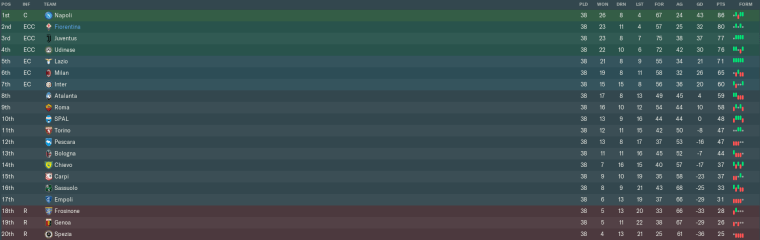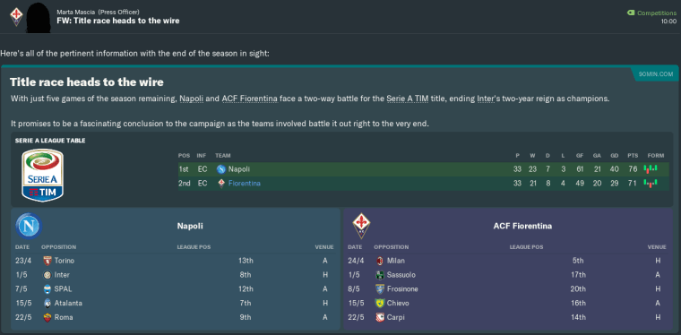 2nd place it was, then. Fiorentina hadn’t finished that high in Italy’s top flight since 1981/1982, so I guess I had to take it.