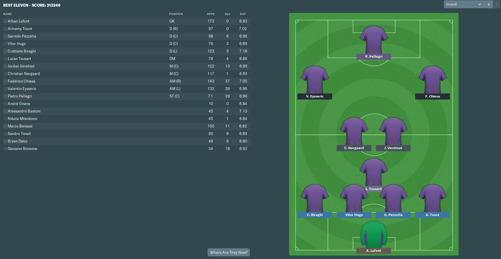 So this is my overall best XI from my four seasons at Fiorentina. While a few of the statistics aren’t quite right, I think the game has nailed my strongest line-up.