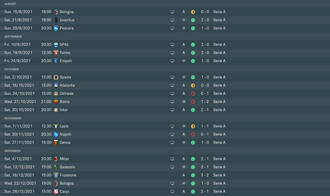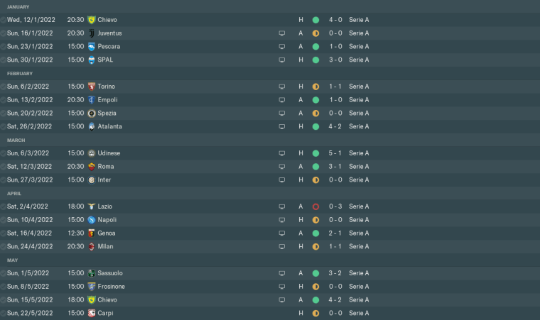 It took a hard-fought home win over Genoa to get us back in business. We started to play a bit more expansively in December, which helped us to record maximum points from five matches. While our defensive record took a bit of a hit (particularly from Frosinone), we were now in 3rd place and starting to play like serious title contenders.