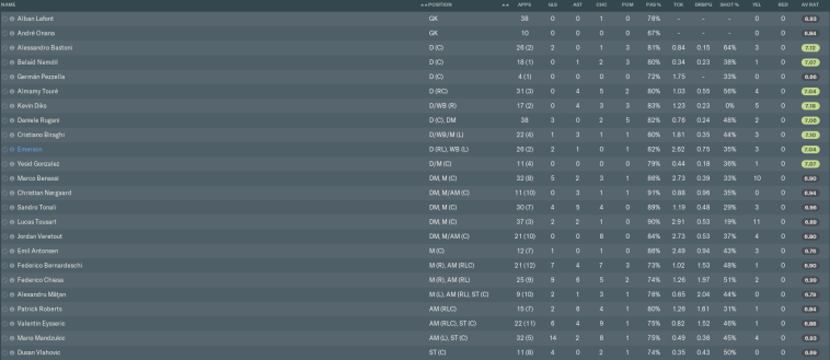 Those greeny-yellow average ratings on the top-right of the player statistics screen immediately jump out. All eight first-team defenders who saw regular action (excluding Germán Pezzella, who seldom played due to injury or illness) had an average match rating of above 7.00. Though right-back Kevin Diks scored highest, he only played in 19 matches, which meant Bastoni was ‘technically’ the best of our regular starters.