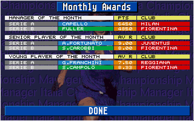 CM93/94 was the first game in the series to include real player names (the original Championship Manager from 1992 had entirely fictional players). However, one could still only manage in the English leagues… until a new version came out that made the Italian leagues playable. On Championship Manager Italia, you could take charge of any team from Serie A or Serie B, and lead them to glory.
