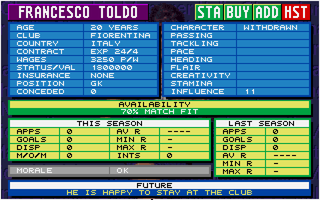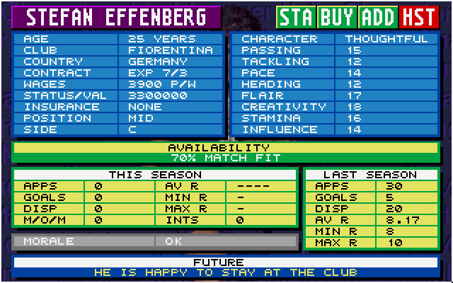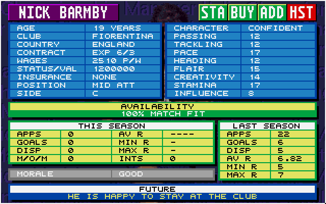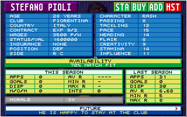 We now had four non-Italian players on our books. That perhaps wasn’t the smartest move on my part, as we were only allowed to play three foreigners at most in Serie A and Coppa Italia matches, and (I believe) only two in the Anglo-Italian Cup. We couldn’t use Batistuta, Effenberg, Wilkins and Barmby all at the same time, so I would need to think carefully about who would play and who would sit on the sidelines.