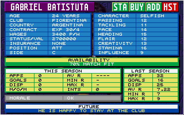 Finally, we come to the attackers, and who better to start with than the main man himself? Gabriel Batistuta is in his third year at the club, and looking to build on the 16 goals he got in last season’s valiant attempt to keep us up. While there is no specific attribute for shooting or finishing, the 24-year-old Argentine has enough pace, stamina and creativity to cause problems.