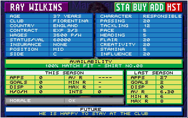 Yes, it was indeed the late, great Ray Wilkins. Signed for £100,000 from England, the evergreen 37-year-old still has fantastic passing ability. ‘Butch’ will likely be my captain for this season (with Effenberg and Bruno as deputies), and he’ll lend us invaluable experience from when he played for Milan in Serie A during the mid-1980s.