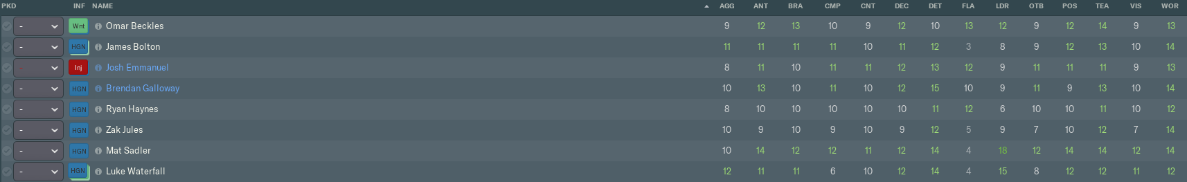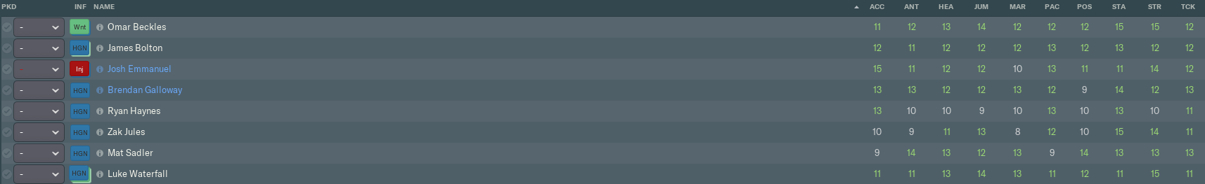 When it comes to defensive attributes, we’re looking pretty solid. Our centre-backs are generally strong in the air and effective man-markers, though Sadler is the only one to score 13 or more on Tackling. In that respect, it’s probably a good idea they’re staying on their feet instead of ‘getting stuck in’.
